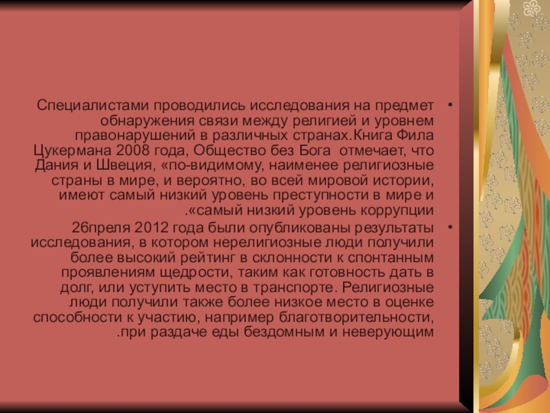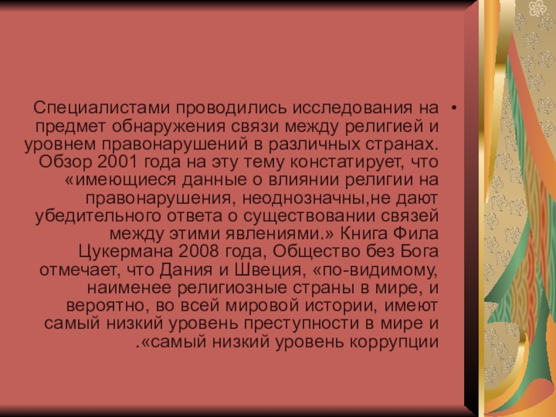 правонарушений в различных странах.Обзор 2001 года на эту тему констатирует, что «имеющиеся данные о влиянии религии на правонарушения, неоднозначны,не дают убедительного ответа о существовании связей между этими явлениями.» Книга Фила Цукермана 2008 года, Общество без Бога отмечает, что Дания и Швеция, «по-видимому, наименее религиозные страны в мире, и вероятно, во всей мировой истории, имеют самый низкий уровень преступности в мире и самый низкий уровень коррупции».