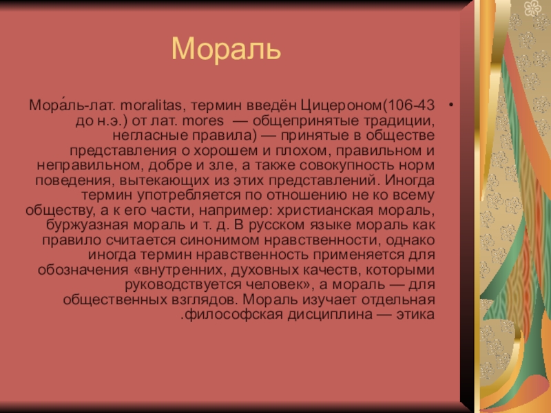 Мора́ль-лат. moralitas, термин введён Цицероном(106-43 до н.э.) от лат. mores —