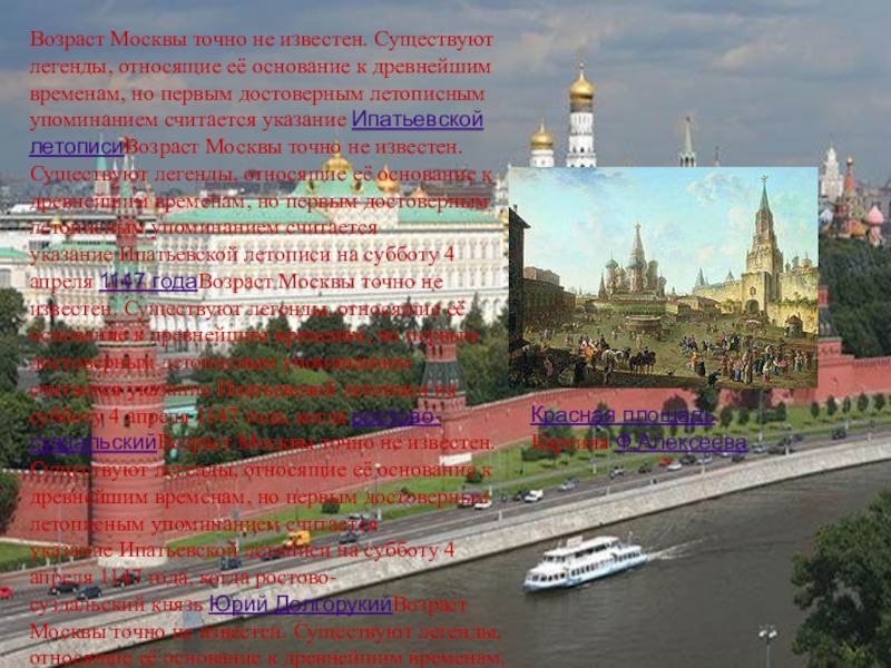 Слайд 3Возраст Москвы точно не известен. Существуют легенды, относящие её основание к