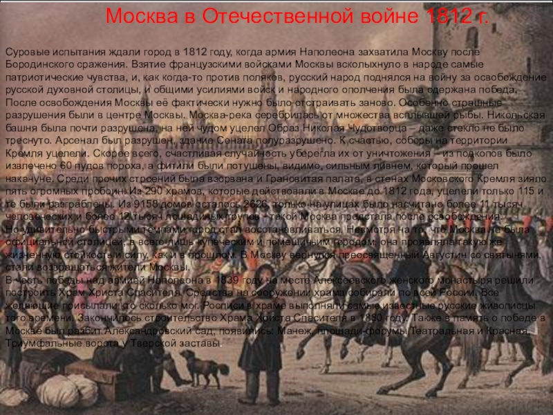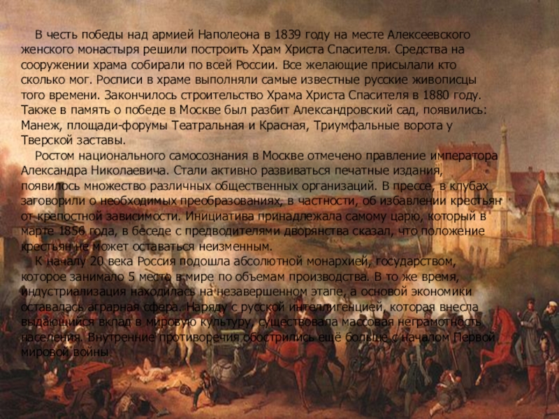 В честь победы над армией Наполеона в 1839 году на месте Алексеевского женского монастыря решили построить Храм Христа Спасителя. Средства на сооружении храма собирали по всей России. Все желающие присылали кто сколько мог. Росписи в храме выполняли самые известные русские живописцы того времени. Закончилось строительство Храма Христа Спасителя в 1880 году. Также в память о победе в Москве был разбит Александровский сад, появились: Манеж, площади-форумы Театральная и Красная, Триумфальные ворота у Тверской заставы.