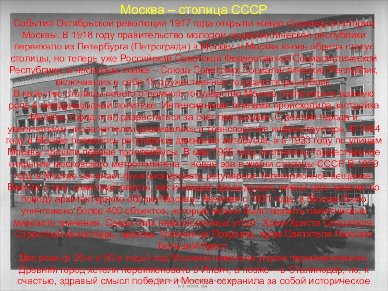 В качестве столицы нового огромного государства Москва стала играть важную роль в международной политике. Интенсивными темпами происходила застройка Москвы, город стал разрастаться за счет пригородов. С ростом города и увеличением числа жителей развивалась и транспортная инфраструктура. В 1924 году в Москве появилось регулярное движение автобусов, а в 1933 году по улицам Москвы прошли первые троллейбусы. В мае 1935 году состоялось торжественное открытие московского метрополитена – новая эра в жизни столицы СССР. В 1939 году в Москве начинает функционировать регулярное телевизионное вещание.