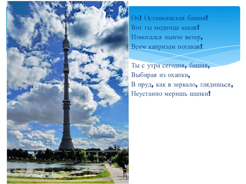 Ох! Останкинская башня!Вот ты модница какая!Измотался нынче ветер,Всем капризам потакая!Ты с утра сегодня, башня,Выбирая из охапки,В пруд,