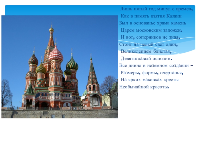 Лишь пятый год минул с времен, Как в память взятия КазаниБыл в основанье храма камень Царем