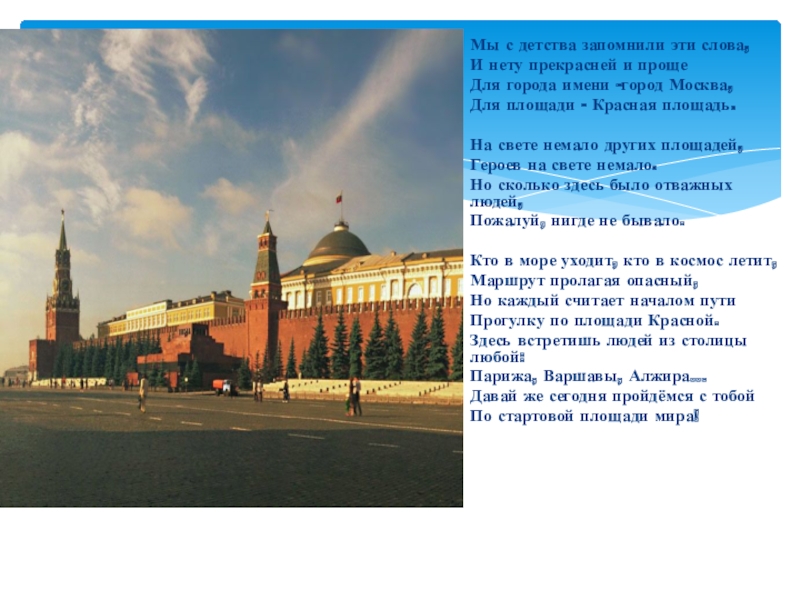 Мы с детства запомнили эти слова,И нету прекрасней и прощеДля города имени -город Москва,Для площади - Красная