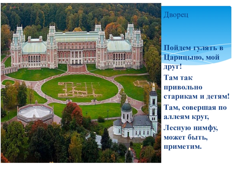 Дворец Пойдем гулять в Царицыно, мой друг! Там так привольно старикам и детям! Там, совершая по аллеям