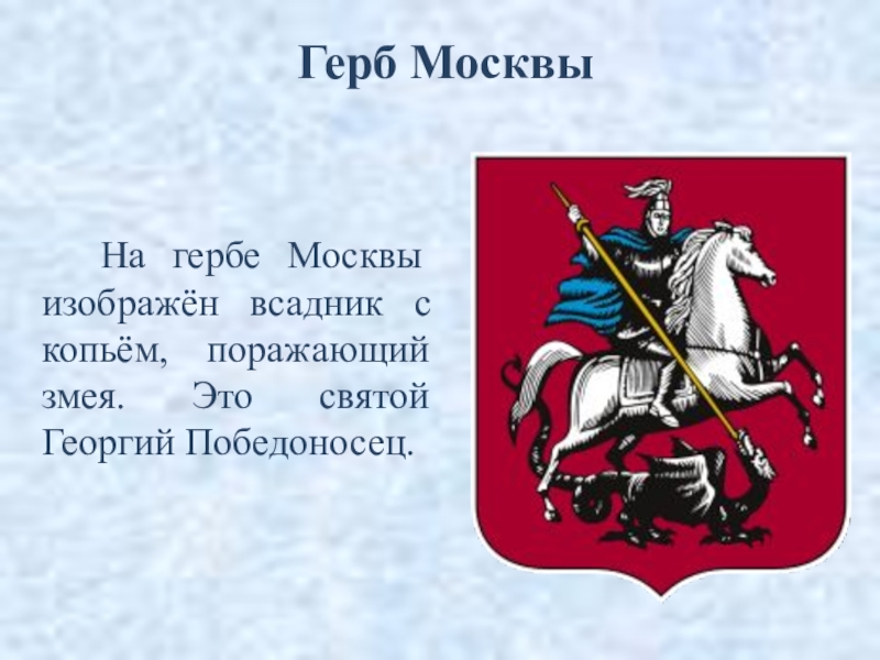 На гербе Москвы изображён всадник с копьём, поражающий змея. Это святой Георгий Победоносец.Герб Москвы
