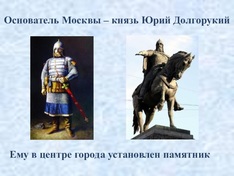 Основатель Москвы – князь Юрий ДолгорукийЕму в центре города установлен памятник