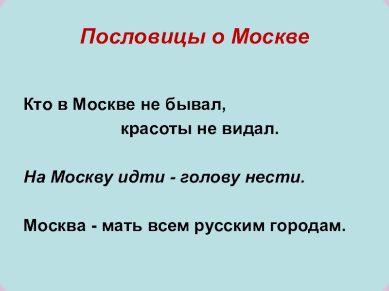Пословицы о МосквеКто в Москве не бывал, 					красоты не видал.На Москву идти - голову нести.Москва - мать