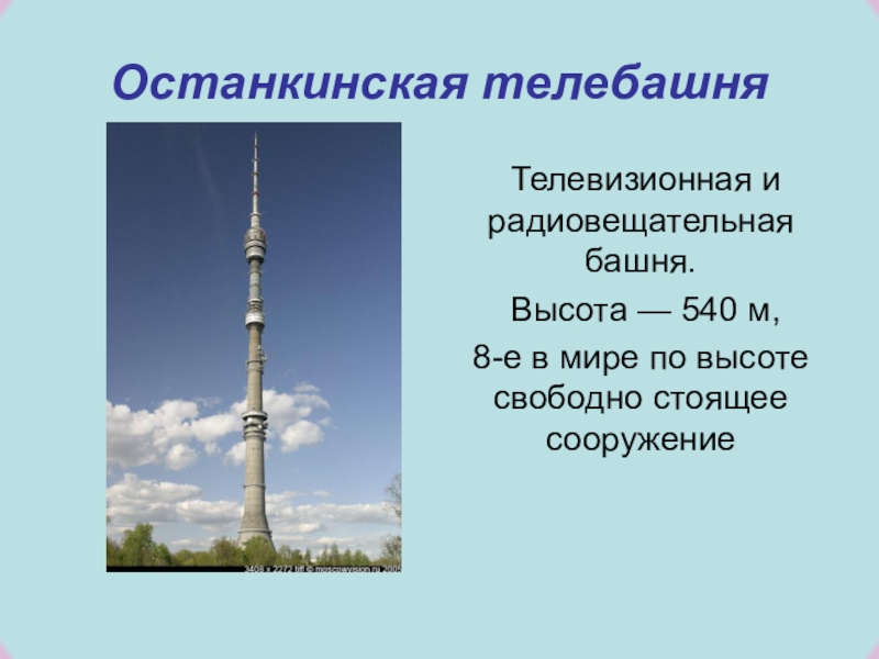 Останкинская телебашня Телевизионная и радиовещательная башня. Высота — 540 м, 8-е в мире по высоте свободно стоящее сооружение
