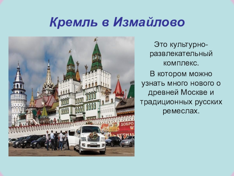 Кремль в ИзмайловоЭто культурно-развлекательный комплекс.В котором можно узнать много нового о древней Москве и традиционных русских ремеслах.