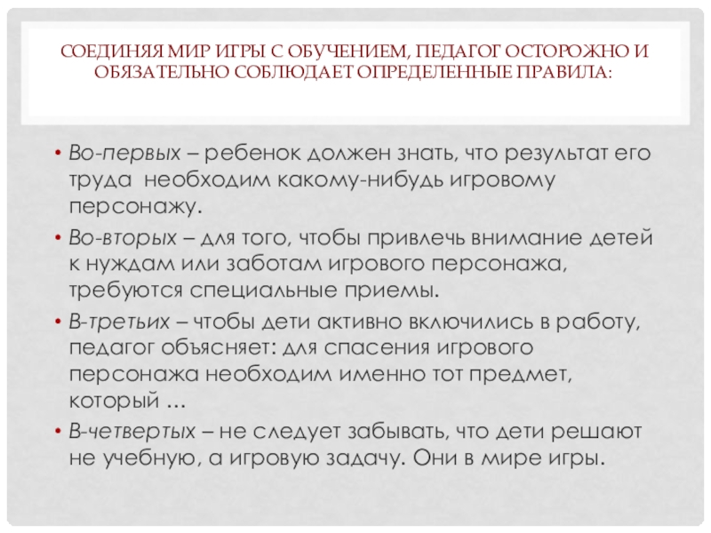 Слайд 15соединяя мир игры с обучением, педагог осторожно и обязательно соблюдает определенные