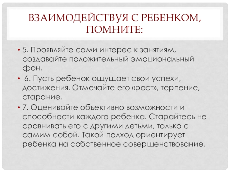 7. Оценивайте объективно возможности и способности каждого ребенка. Старайтесь не сравнивать его с другими детьми, только с самим собой. Такой подход ориентирует ребенка на собственное совершенствование.