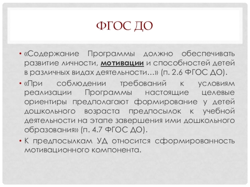 «При соблюдении требований к условиям реализации Программы настоящие целевые ориентиры предполагают формирование у детей дошкольного возраста предпосылок к учебной деятельности на этапе завершения ими дошкольного образования» (п. 4.7 ФГОС ДО).