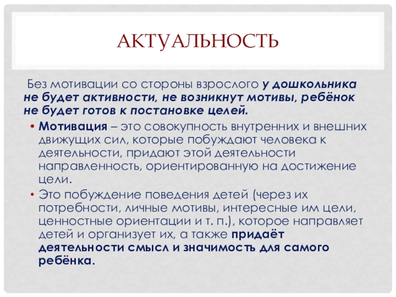 Это побуждение поведения детей (через их потребности, личные мотивы, интересные им цели, ценностные ориентации и т. п.), которое направляет детей и организует их, а также придаёт деятельности смысл и значимость для самого ребёнка.