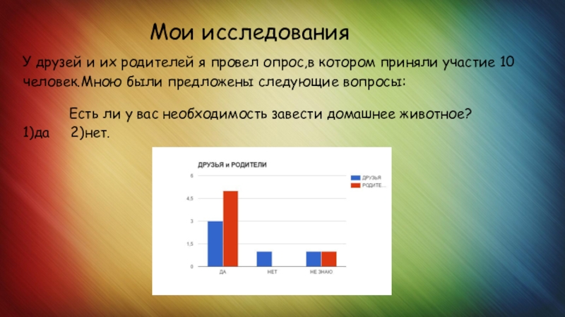 У друзей и их родителей я провел опрос,в котором приняли участие 10 человек.Мною были предложены следующие вопросы: