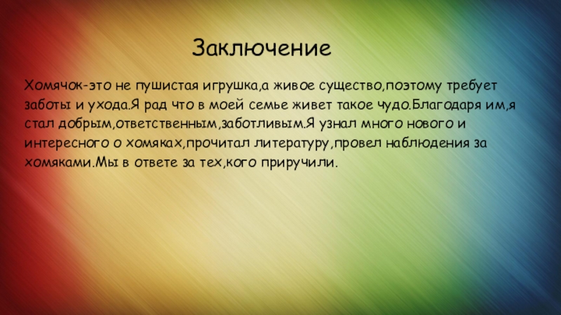 Хомячок-это не пушистая игрушка,а живое существо,поэтому требует заботы и ухода.Я рад что в моей семье живет такое чудо.Благодаря им,я стал добрым,ответственным,заботливым.Я узнал много нового и интересного о хомяках,прочитал литературу,провел наблюдения за хомяками.Мы в ответе за тех,кого приручили.