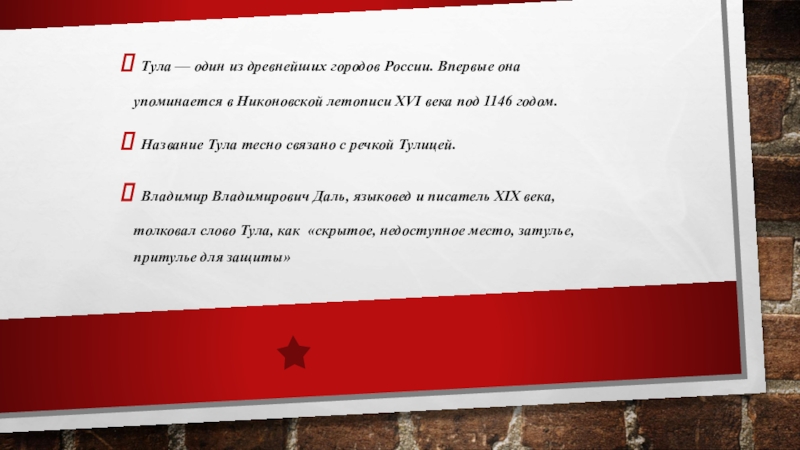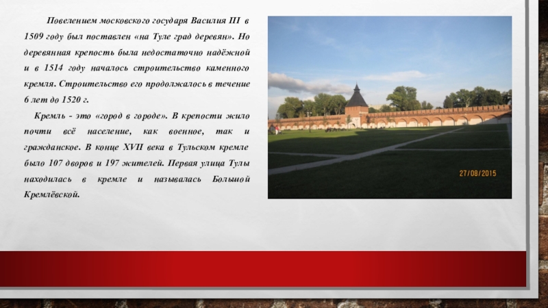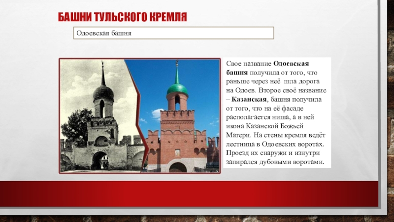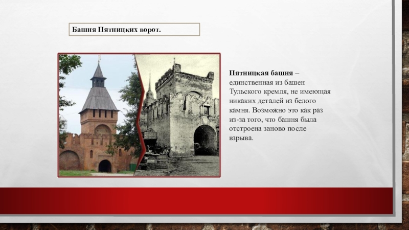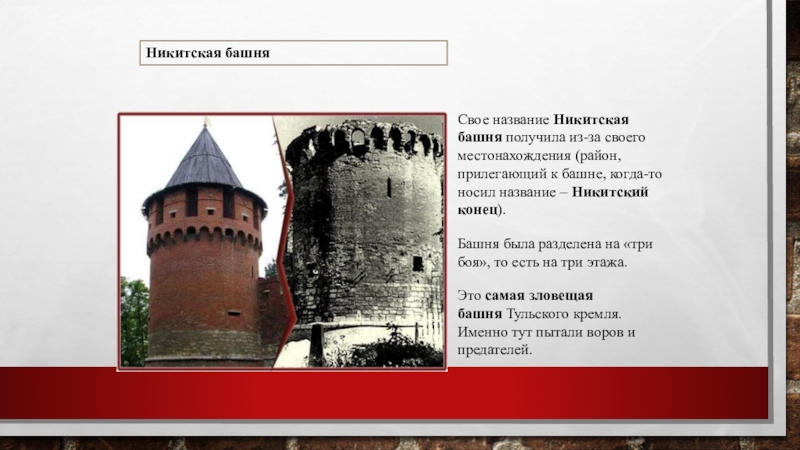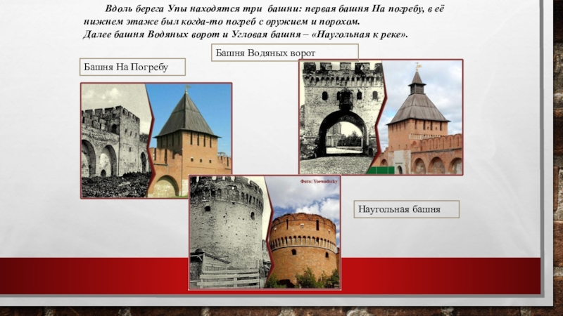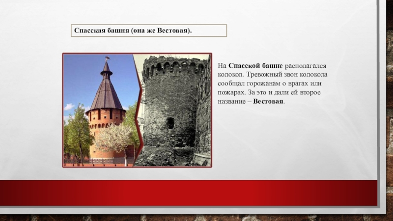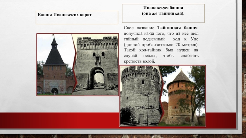 Свое название Тайницкая башня получила из-за того, что из неё шёл тайный подземный ход к Упе (длиной приблизительно 70 метров). Такой ход-тайник был нужен на случай осады, чтобы снабжать крепость водой.