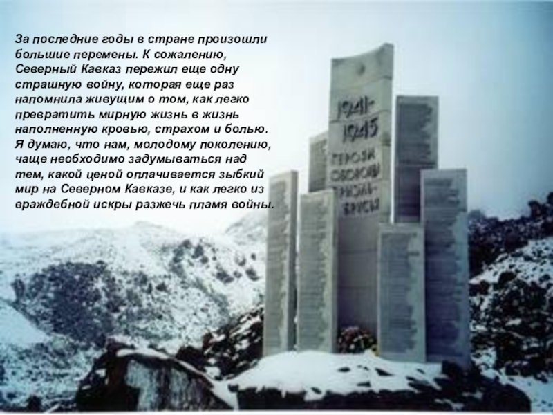 За последние годы в стране произошли большие перемены. К сожалению, Северный Кавказ пережил еще одну страшную войну, которая еще раз напомнила живущим о том, как легко превратить мирную жизнь в жизнь наполненную кровью, страхом и болью.