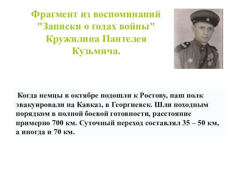 Когда немцы в октябре подошли к Ростову, наш полк эвакуировали на Кавказ, в Георгиевск. Шли походным порядком в полной боевой готовности, расстояние примерно 700 км. Суточный переход составлял 35 – 50 км, а иногда и 70 км.