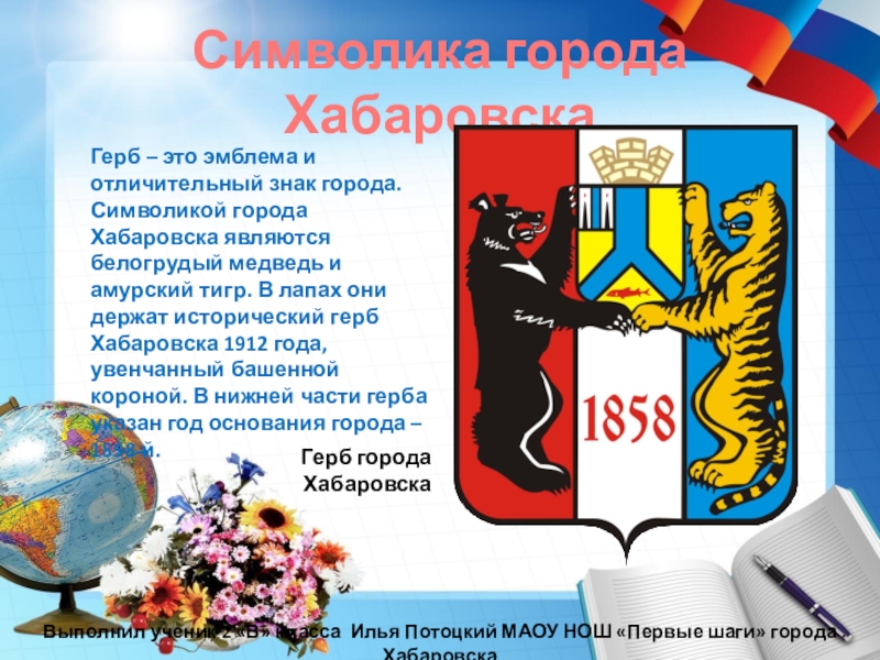 Герб – это эмблема и отличительный знак города. Символикой города Хабаровска являются белогрудый медведь и амурский тигр. В лапах они держат исторический герб Хабаровска 1912 года, увенчанный башенной короной. В нижней части герба указан год основания города – 1858-й.