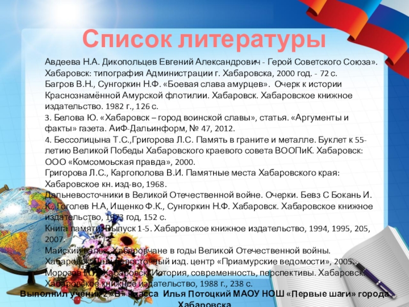 Авдеева Н.А. Дикопольцев Евгений Александрович - Герой Советского Союза». Хабаровск: типография Администрации г. Хабаровска, 2000 год. - 72 с.
