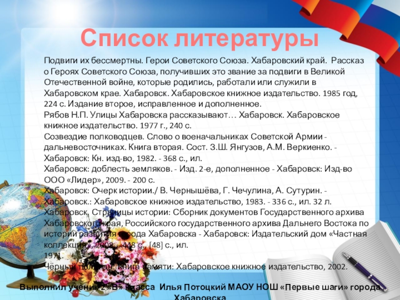4. Бессолицына Т.С.,Григорова Л.С. Память в граните и металле. Буклет к 55-летию Великой Победы Хабаровского краевого совета ВООПиК. Хабаровск: ООО «Комсомоьская правда», 2000.