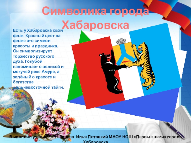 Есть у Хабаровска свой флаг. Красный цвет на флаге это символ красоты и праздника. Он символизирует торжество русского духа. Голубой напоминает о великой и могучей реке Амуре, а зелёный о красоте и богатстве дальневосточной тайги.