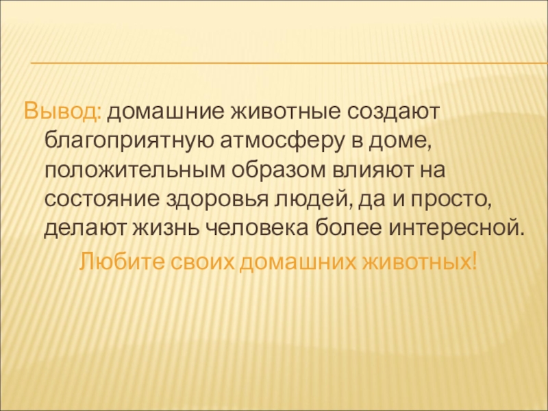 Вывод: домашние животные создают благоприятную атмосферу в доме, положительным образом влияют на состояние здоровья людей, да и просто, делают жизнь человека более интересной.
