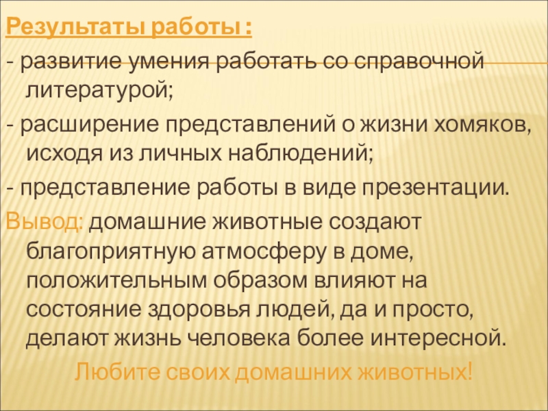 Слайд 18Вывод: домашние животные создают благоприятную атмосферу в доме, положительным образом влияют