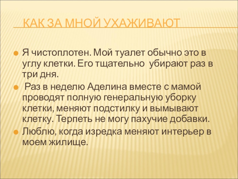 Раз в неделю Аделина вместе с мамой проводят полную генеральную уборку клетки, меняют подстилку и вымывают клетку. Терпеть не могу пахучие добавки.