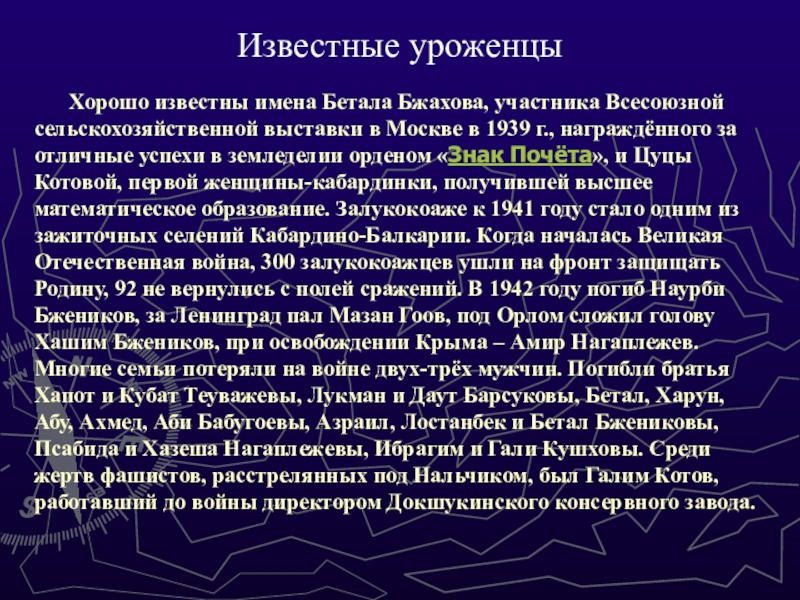 Бжахова, участника Всесоюзной сельскохозяйственной выставки в Москве в 1939 г., награждённого за отличные успехи в земледелии орденом «Знак Почёта», и Цуцы Котовой, первой женщины-кабардинки, получившей высшее математическое образование. Залукокоаже к 1941 году стало одним из зажиточных селений Кабардино-Балкарии. Когда началась Великая Отечественная война, 300 залукокоажцев ушли на фронт защищать Родину, 92 не вернулись с полей сражений. В 1942 году погиб Наурби Бжеников, за Ленинград пал Мазан Гоов, под Орлом сложил голову Хашим Бжеников, при освобождении Крыма – Амир Нагаплежев. Многие семьи потеряли на войне двух-трёх мужчин. Погибли братья Хапот и Кубат Теуважевы, Лукман и Даут Барсуковы, Бетал, Харун, Абу, Ахмед, Аби Бабугоевы, Азраил, Лостанбек и Бетал Бжениковы, Псабида и Хазеша Нагаплежевы, Ибрагим и Гали Кушховы. Среди жертв фашистов, расстрелянных под Нальчиком, был Галим Котов, работавший до войны директором Докшукинского консервного завода.