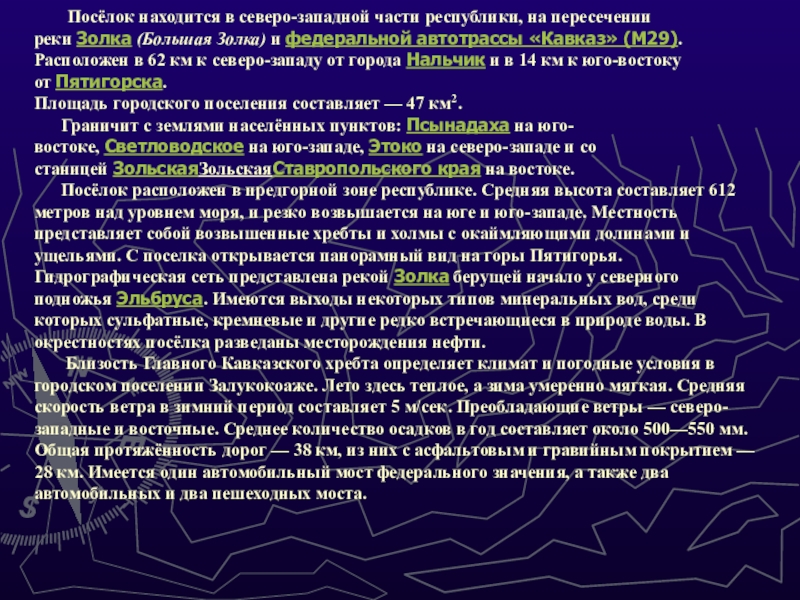 пересечении реки Золка (Большая Золка) и федеральной автотрассы «Кавказ» (М29). Расположен в 62 км к северо-западу от города Нальчик и в 14 км к юго-востоку от Пятигорска.