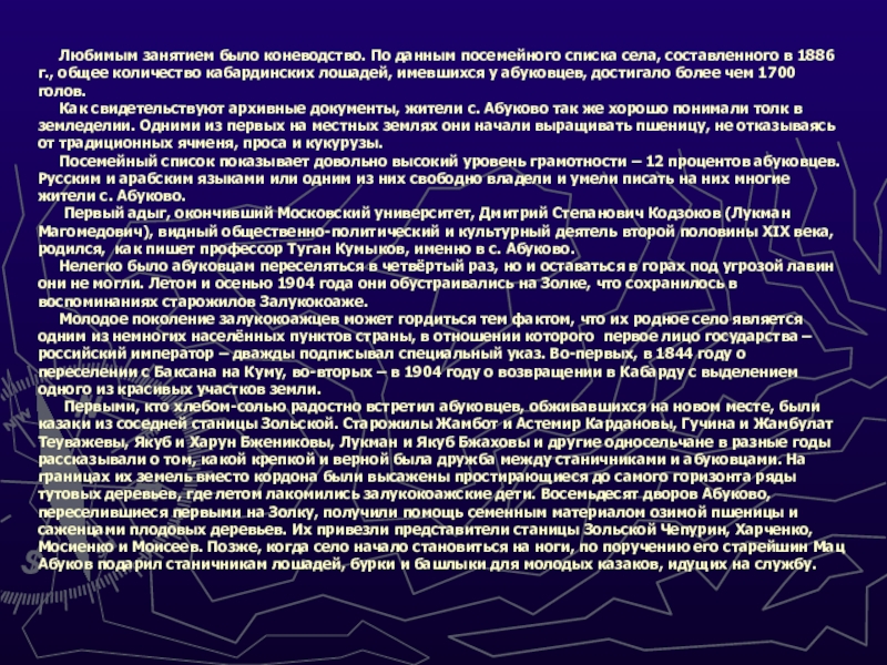 села, составленного в 1886 г., общее количество кабардинских лошадей, имевшихся у абуковцев, достигало более чем 1700 голов.