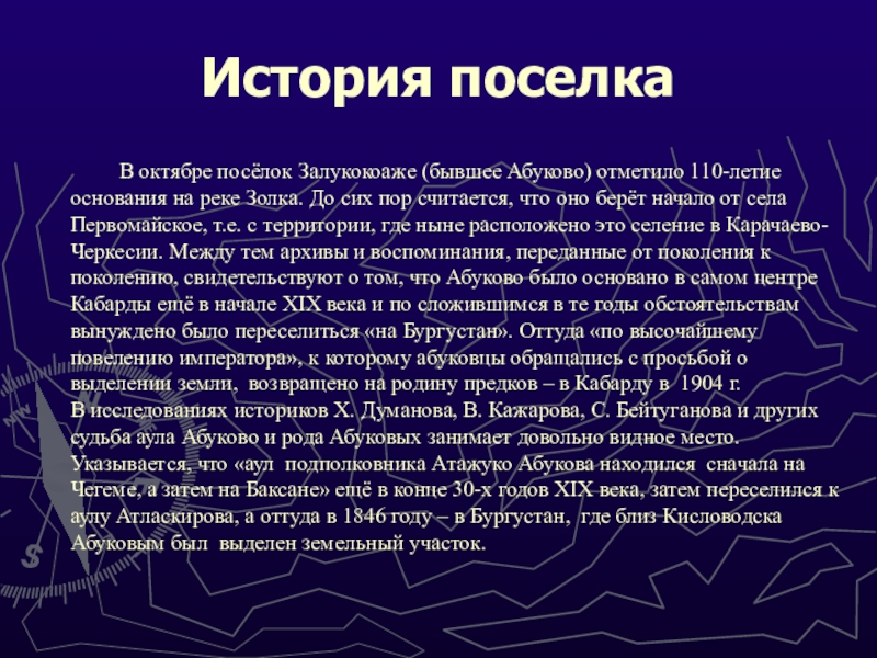 посёлок Залукокоаже (бывшее Абуково) отметило 110-летие основания на реке Золка. До сих пор считается, что оно берёт начало от села Первомайское, т.е. с территории, где ныне расположено это селение в Карачаево-Черкесии. Между тем архивы и воспоминания, переданные от поколения к поколению, свидетельствуют о том, что Абуково было основано в самом центре Кабарды ещё в начале XIX века и по сложившимся в те годы обстоятельствам вынуждено было переселиться «на Бургустан». Оттуда «по высочайшему повелению императора», к которому абуковцы обращались с просьбой о выделении земли, возвращено на родину предков – в Кабарду в 1904 г.