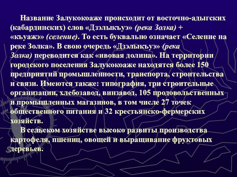 (кабардинских) слов «Дзэлыкъуэ» (река Золка) + «къуажэ» (селение). То есть буквально означает «Селение на реке Золка». В свою очередь «Дзэлыкъуэ» (река Золка) переводится как «ивовая долина». На территории городского поселения Залукокоаже находятся более 150 предприятий промышленности, транспорта, строительства и связи. Имеются также: типография, три строительные организации, хлебозавод, винзавод, 105 продовольственных и промышленных магазинов, в том числе 27 точек общественного питания и 32 крестьянско-фермерских хозяйств.