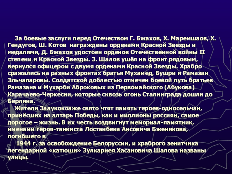 Г. Бжахов, Х. Маремшаов, Х. Гендугов, Ш. Котов награждены орденами Красной Звезды и медалями, Д. Бжахов удостоен орденов Отечественной войны II степени и Красной Звезды. З. Шалов ушёл на фронт рядовым, вернулся офицером с двумя орденами Красной Звезды. Храбро сражались на разных фронтах братья Мухамед, Бушри и Рамазан Эльчапаровы. Солдатской доблестью отмечен боевой путь братьев Рамазана и Мухарби Аброковых из Первомайского (Абукова) Карачаево-Черкесии, которые сквозь огонь Сталинграда дошли до Берлина.
