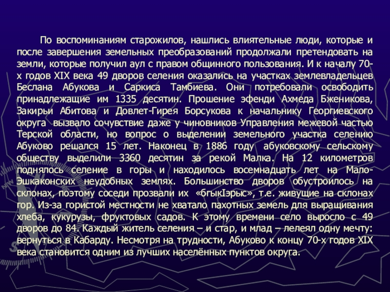 после завершения земельных преобразований продолжали претендовать на земли, которые получил аул с правом общинного пользования. И к началу 70-х годов XIX века 49 дворов селения оказались на участках землевладельцев Беслана Абукова и Саркиса Тамбиева. Они потребовали освободить принадлежащие им 1335 десятин. Прошение эфенди Ахмеда Бженикова, Закирьи Абитова и Довлет-Гирея Борсукова к начальнику Георгиевского округа вызвало сочувствие даже у чиновников Управления межевой частью Терской области, но вопрос о выделении земельного участка селению Абуково решался 15 лет. Наконец в 1886 году абуковскому сельскому обществу выделили 3360 десятин за рекой Малка. На 12 километров поднялось селение в горы и находилось восемнадцать лет на Мало-Эшкаконских неудобных землях. Большинство дворов обустроилось на склонах, поэтому соседи прозвали их «бгыкIэрыс», т.е. живущие на склонах гор. Из-за гористой местности не хватало пахотных земель для выращивания хлеба, кукурузы, фруктовых садов. К этому времени село выросло с 49 дворов до 84. Каждый житель селения – и стар, и млад – лелеял одну мечту: вернуться в Кабарду. Несмотря на трудности, Абуково к концу 70-х годов XIX века становится одним из лучших населённых пунктов округа.