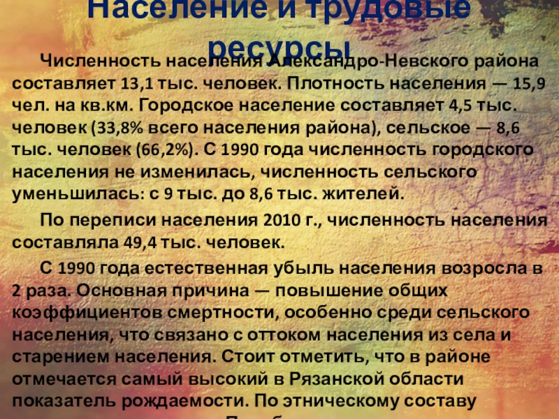 Численность населения Александро-Невского района составляет 13,1 тыс. человек.