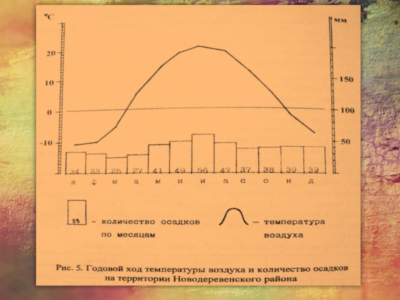 Для самого холодного месяца — января — среднемесячная температура воздуха составляет - 1 °С. В июле —годовая амплитуда температур составляет более 30°С.(рис.5). Сумма осадков за год — 465 мм. За тёплый период (апрель — октябрь) выпадает 300 мм осадков, в том числе в период с темпера-турой воздуха выше + 10°С - 250 мм. То есть, основная часть осадков приходится на период активной вегетации растений.
