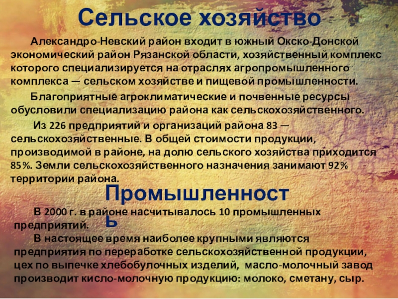 Благоприятные агроклиматические и почвенные ресурсы обусловили специализацию района как сельскохозяйственного.