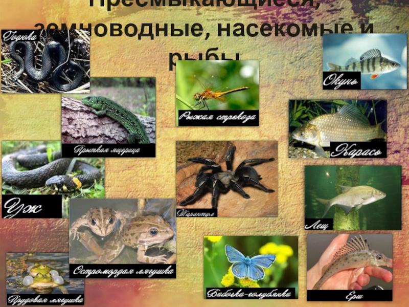 Слайд 19Пресмыкающиеся, земноводные, насекомые и рыбы