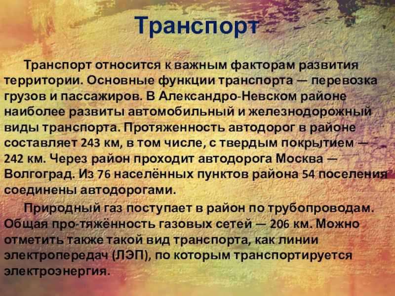 перевозка грузов и пассажиров. В Александро-Невском районе наиболее развиты автомобильный и железнодорожный виды транспорта. Протяженность автодорог в районе составляет 243 км, в том числе, с твердым покрытием — 242 км. Через район проходит автодорога Москва — Волгоград. Из 76 населённых пунктов района 54 поселения соединены автодорогами.