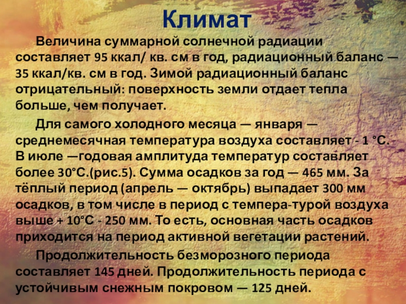 Величина суммарной солнечной радиации составляет 95 ккал/ кв. см в год,