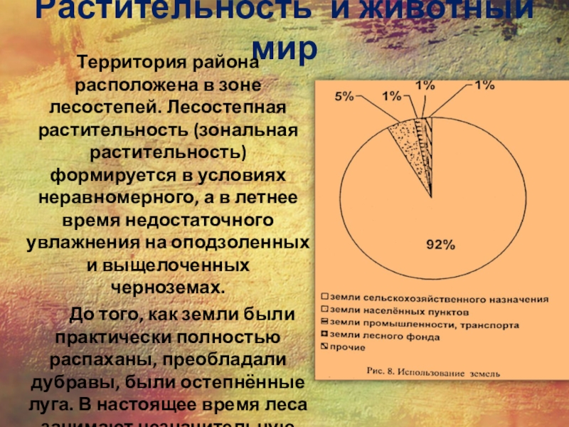 До того, как земли были практически полностью распаханы, преобладали дубравы, были остепнённые луга. В настоящее время леса занимают незначительную часть территории района (рис. 8)
