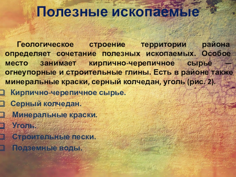Геологическое строение территории района определяет сочетание полезных ископаемых. Особое
