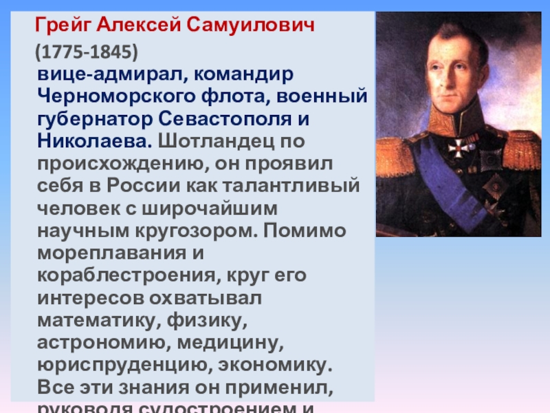губернатор Севастополя и Николаева. Шотландец по происхождению, он проявил себя в России как талантливый человек с широчайшим научным кругозором. Помимо мореплавания и кораблестроения, круг его интересов охватывал математику, физику, астрономию, медицину, юриспруденцию, экономику. Все эти знания он применил, руководя судостроением и городским хозяйством.