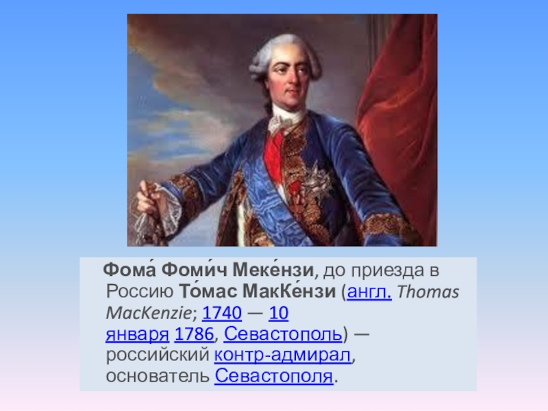 Слайд 7 Фома́ Фоми́ч Меке́нзи, до приезда в Россию То́мас МакКе́нзи (англ. Thomas MacKenzie; 1740 — 10