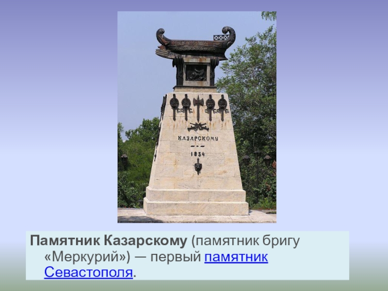 Слайд 13Памятник Казарскому (памятник бригу «Меркурий») — первый памятник Севастополя.