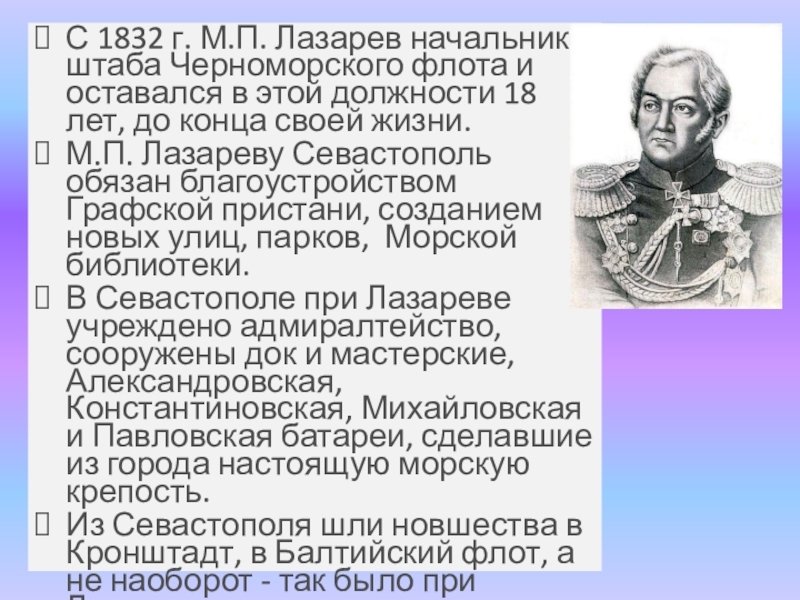 М.П. Лазареву Севастополь обязан благоустройством Графской пристани, созданием новых улиц, парков, Морской библиотеки.