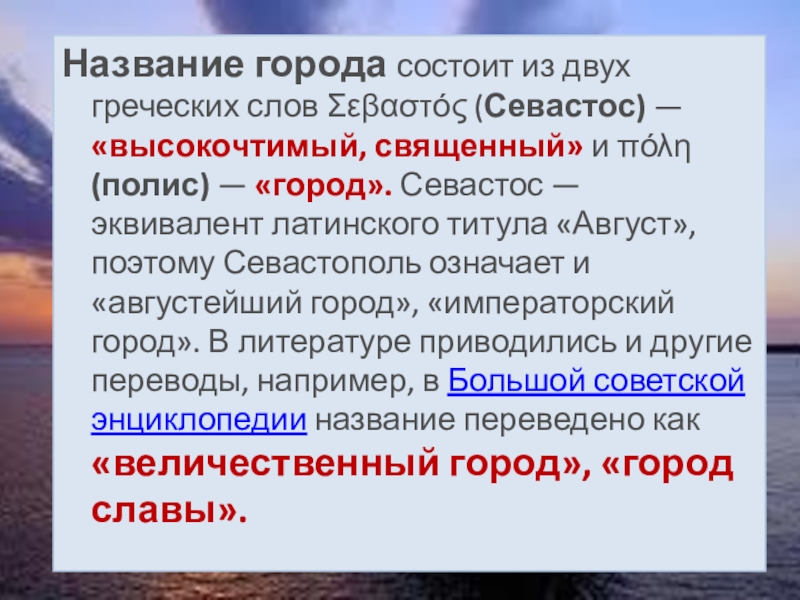 и πόλη (полис) — «город». Севастос — эквивалент латинского титула «Август», поэтому Севастополь означает и «августейший город», «императорский город». В литературе приводились и другие переводы, например, в Большой советской энциклопедии название переведено как «величественный город», «город славы».